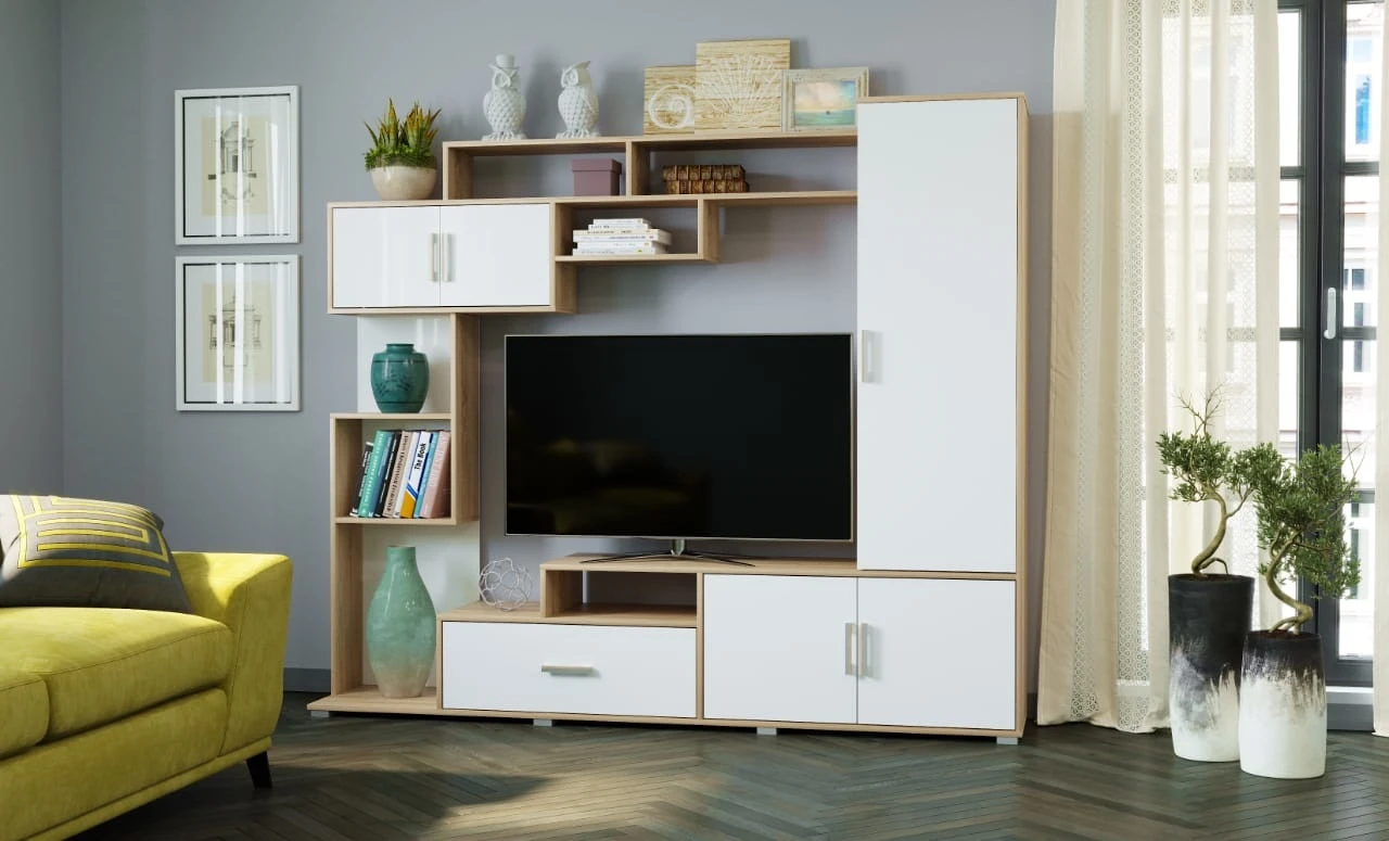 — Асимметричность и открытые полки обеспечивают визуальную лёгкость конструкции.