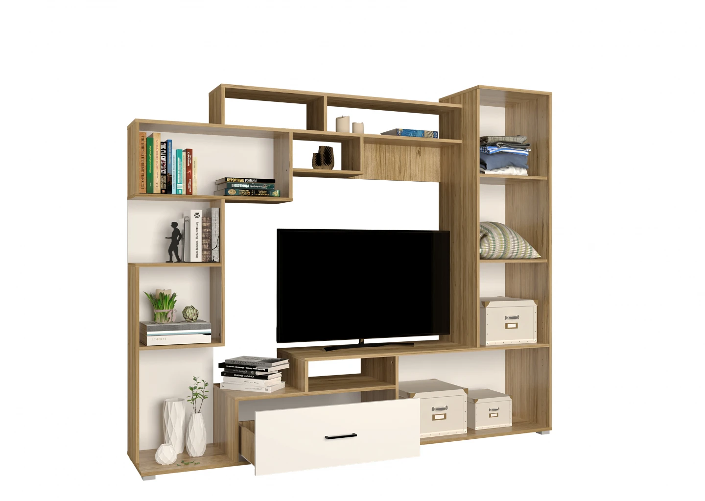 — Содержит большое количество открытых и закрытых полок и выдвижной ящик снизу по центру.