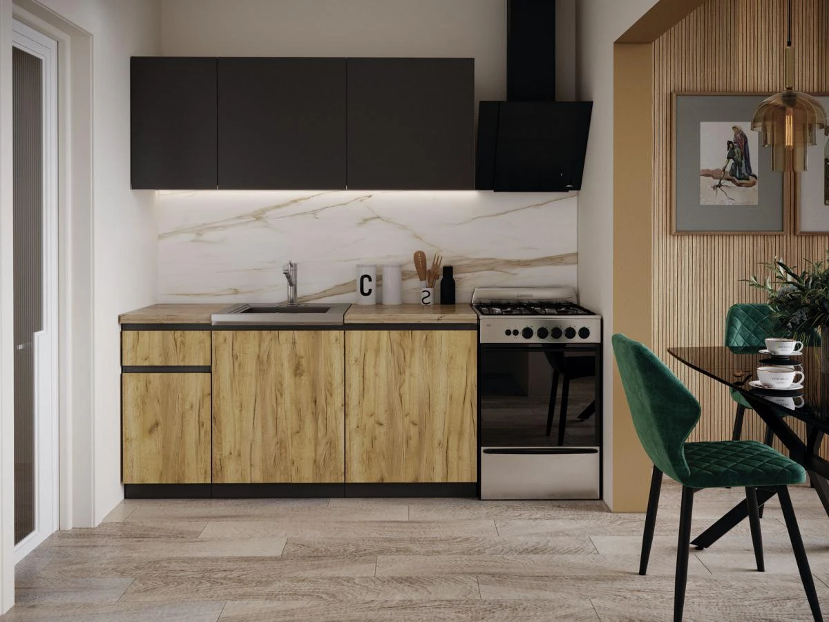 Прочная столешница легко очищается от загрязнений, не требуя специальных моющих средств и герметизации. Створки открываются с помощью зазора между фасадом и верхней частью корпуса, который закрыт планкой.