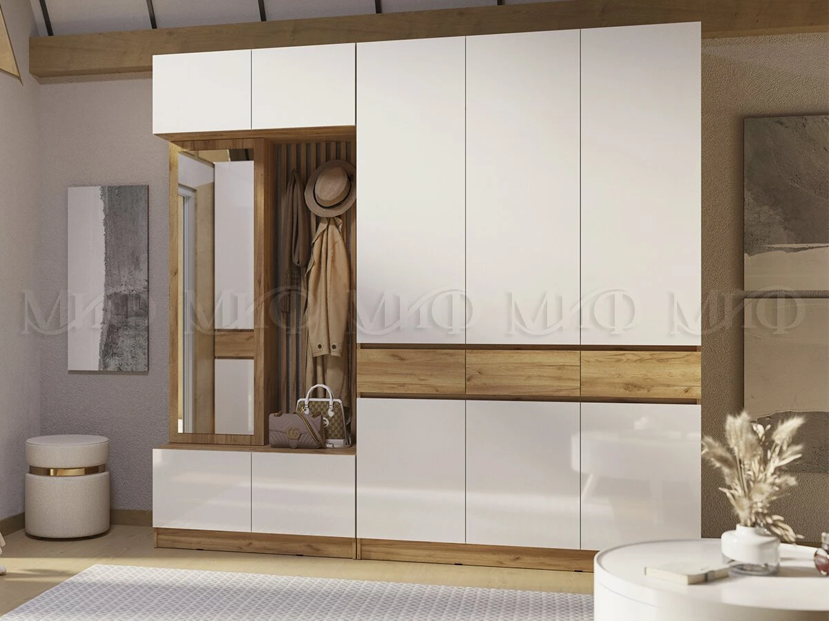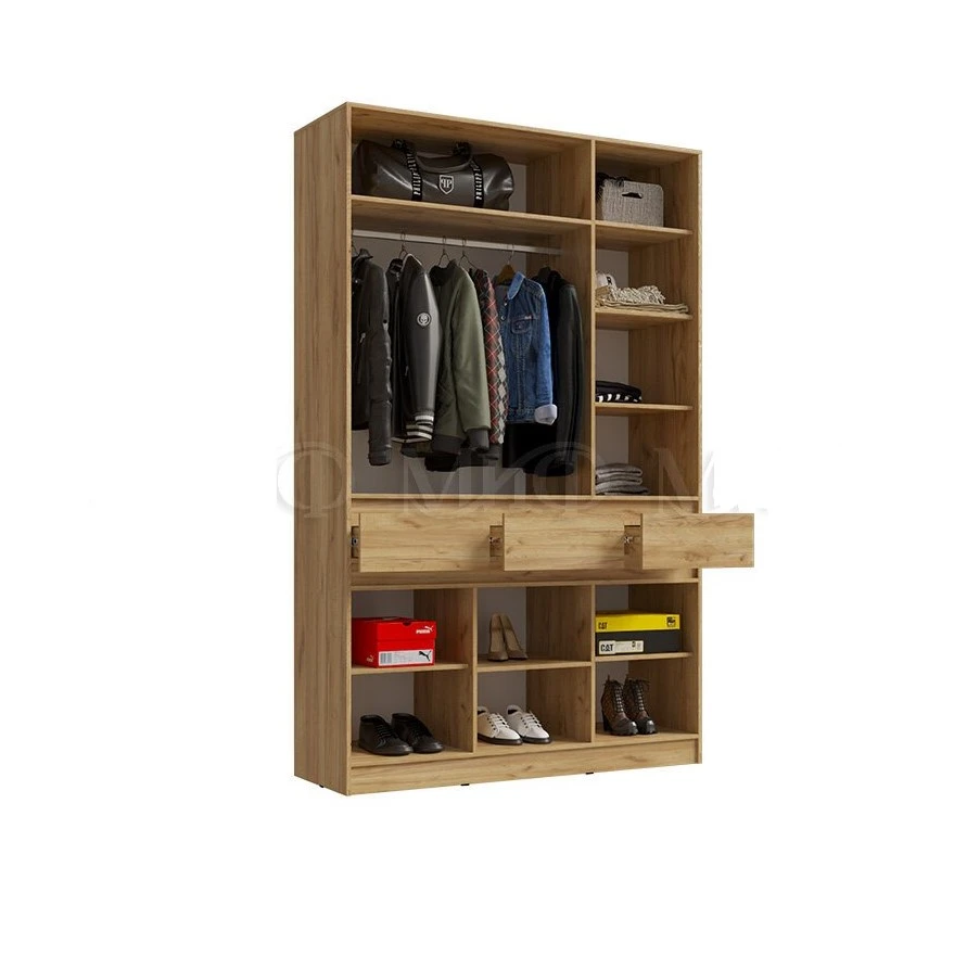 Шкаф Роджина — практичное решение с продуманным наполнением. Ниша со штангой, антресольные полки и выдвижные ящики создают удобную систему хранения.