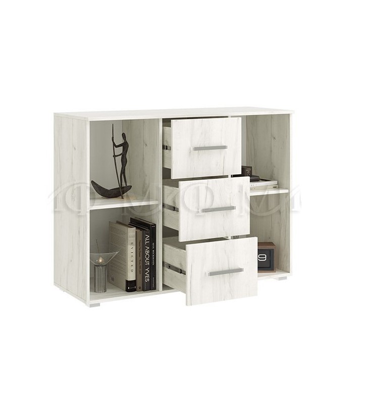 Комод поделен на две секции с распашными дверцами по бокам и вместительную тумбу с тремя ящиками посередине. В отделениях с дверцами имеются две просторные полочки.