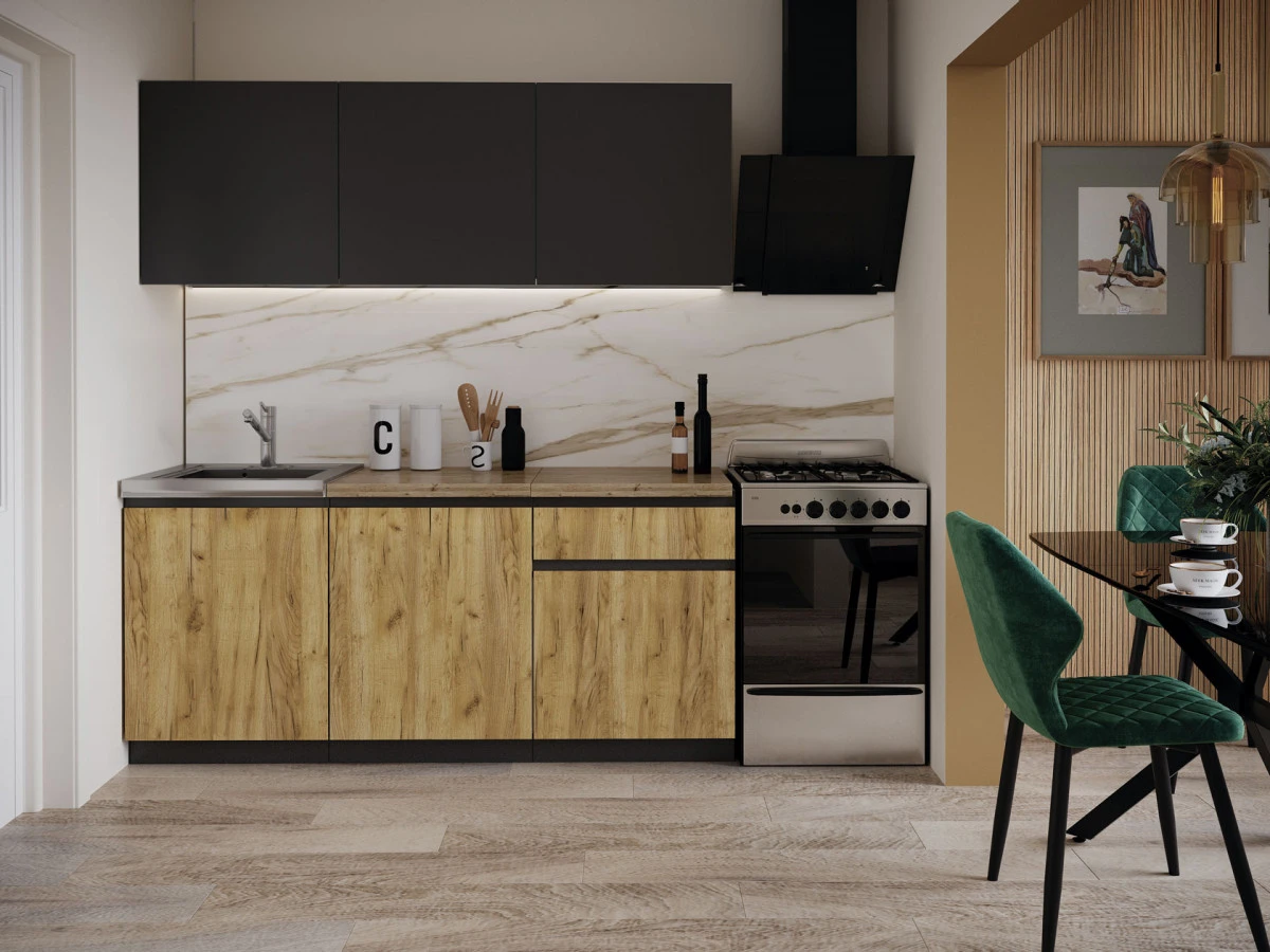 Кухонный гарнитур Ханна отлично подойдет для обустройства небольшого помещения. Элементы с закрытой системой хранения позволят удобно разместить всю необходимую кухонную утварь.