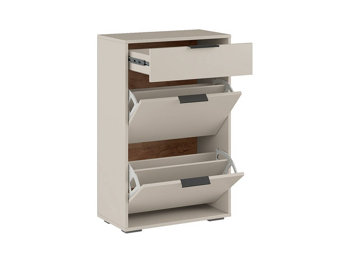Обувница Адель экономит пространство прихожей, организуя компактное хранение всего необходимого. Две вместительные полки оснащены откидными дверцами с металлическими ручками. Небольшой выдвижной ящик предусмотрен для различных мелочей.