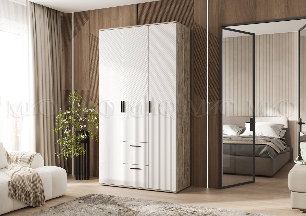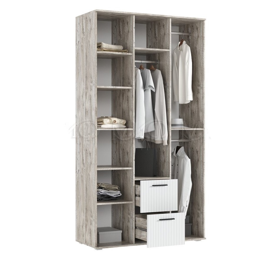 Шкаф трехстворчатый «Сильвия» — изысканное и практичное решение для Вашей прихожей, гостиной либо спальной комнаты. Шкаф включает в себя закрытое пространство с множеством полок, а также отделения со штангами и выдвижными ящиками, что позволит компактно упорядочить одежду и иные вещи.