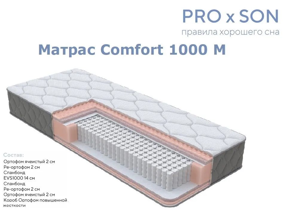 Матрас Орматек Comfort 1000 M — отличный матрас на основе современных наполнителей Ре-Ortofoam и пенного материала Ортофом с микромассажным эффектом, которые повышают износостойкость матраса, а также придают его поверхности оптимальную среднюю жесткость. За поддержку отвечает блок с увеличенным количеством независимых пружин EVS1000, который подстраивается под каждый участок тела обеспечивая высокое качество поддержки. Высота матраса Comfort 1000 M 24 см, жесткость средняя. Современный чехол из белоснежного трикотажа в сочетании с мебельным бурлетом серого цвета создает дополнительный комфорт и придает матрасу прекрасный внешний вид. Боковые торцы матраса укреплены коробом из ортофом повышенной жесткости.